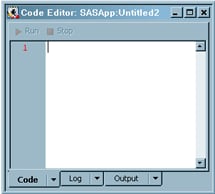 The Code Editor is a window that you can use to develop and execute SAS code. For example, you can use the Code Editor window to develop and verify user-written code, and then you can use that code to replace the generated code for a job or a transformation. The following display shows the Code Editor window.