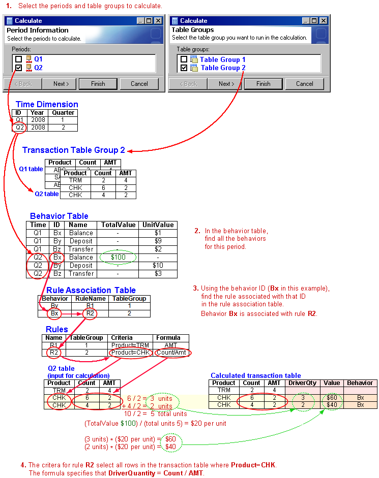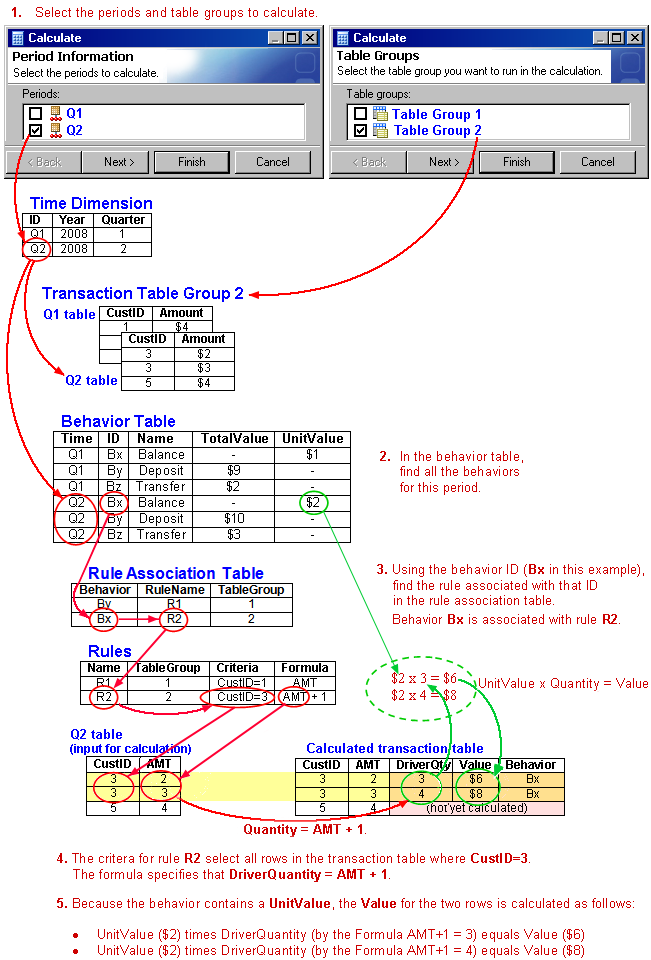 The following pictures show the relationships among the tables that make up a profitability model during the process of calculation.