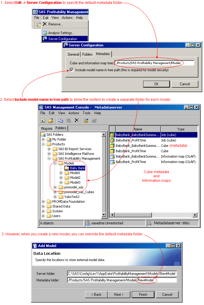 A model's metadata folder (its folder in the SAS Metadata Repository) contains a model's information maps and metadata about the model's cubes. The metadata folder is important because you secure a model by providing security on the folder. This means that all models in a metadata folder share the same security. Therefore, if you want to provide security to individual models, each model must have its own metadata folder.