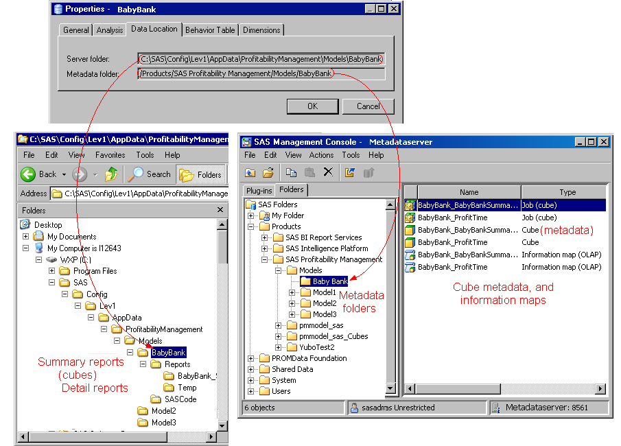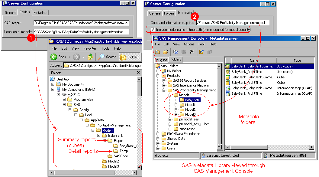 - Looking at the Server Configuration Metadata tab, you can see that for each model at the physical location of models, there is a metadata folder in the SAS Metadata Library (because the flag Include model name in tree path is checked). The metadata folder contains information maps for the model and metadata concerning the model's cubes.