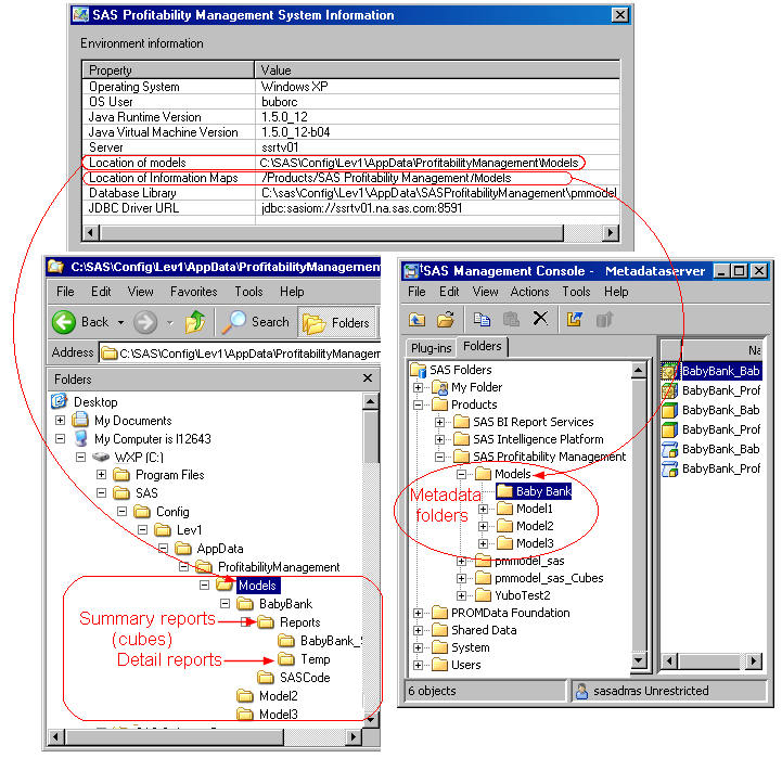 - The physical location of models is C:\SAS\Config\Lev1\AppData\ProfitabilityManagement\Models. By default, each model has a folder under this location where the model's summary reports (cubes) and detail reports (cubes on the fly) are stored.