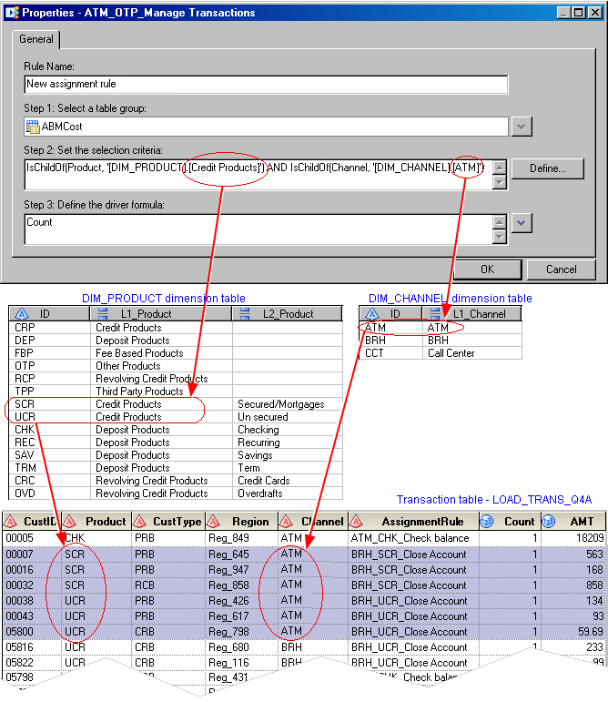 In the following picture, the selection criterion IsChildOf(Product, '[DIM_PRODUCT].[Credit Products]') AND IsChildOf(Channel, '[DIM_CHANNEL].[ATM]') selects six rows in the transaction table: