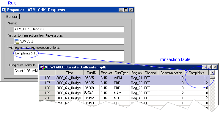 In the following picture, the selection criterion Complaints > 10 selects the first two rows in the transaction table: