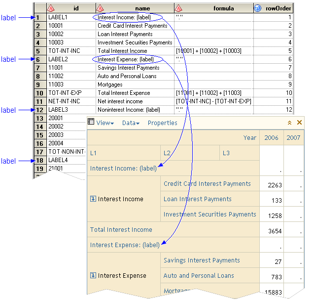 The following picture shows a report layout table with labels and the resulting report: