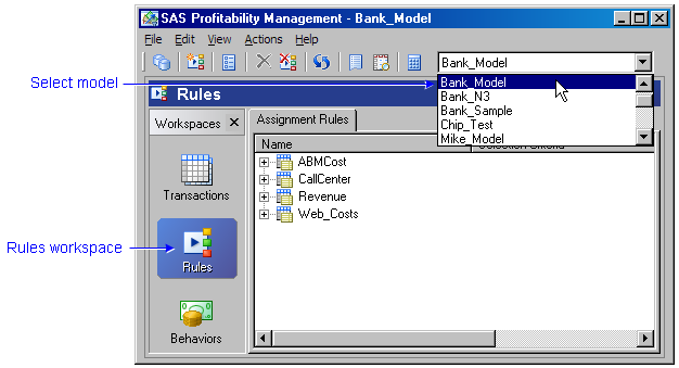 - Activate the Rules workspace, and select the model to which the rules are added.