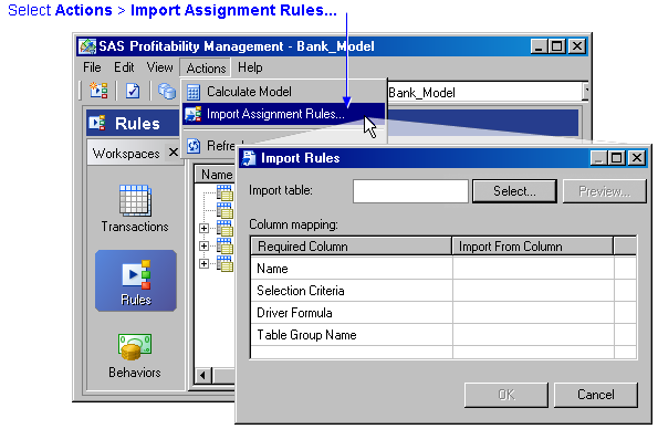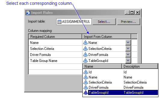 - For each required column in an assignment rules table, identify the corresponding column in the table being imported, and click OK.