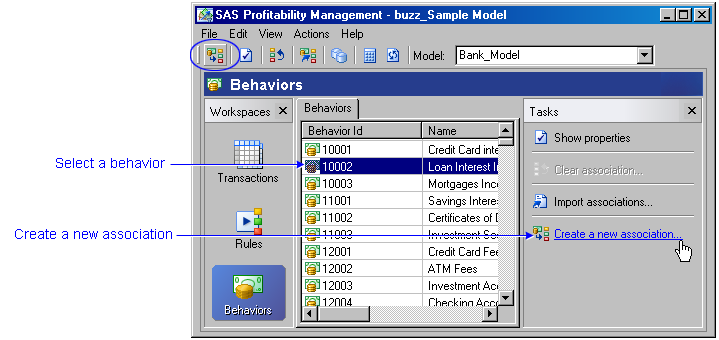 1. Activate the Behaviors workspace, and select the model to which the rule associations are to be added.
