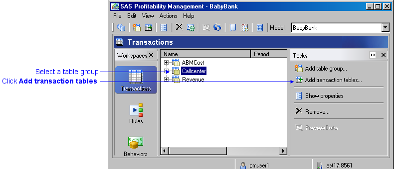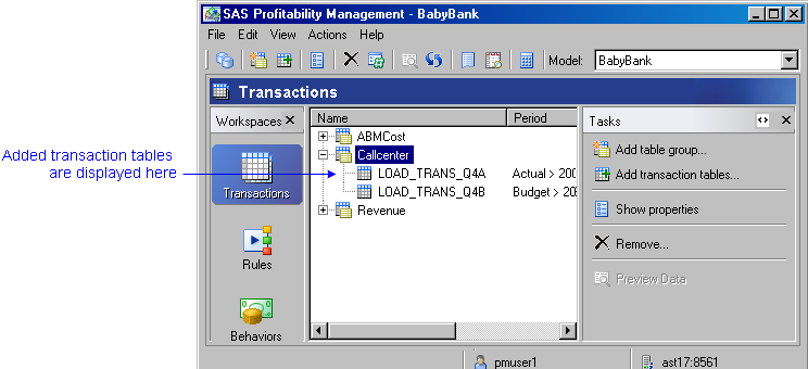 - Activate the Transactions workspace, and select a model.