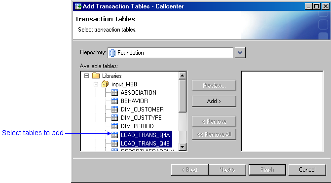 - Select the transaction tables to add to the table group and click Add.