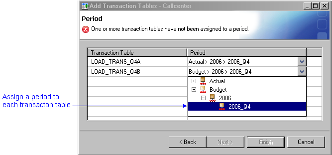 Note: Each transaction table in a model can have one and only one period. And, each period in a model can have only one transaction table. (If you encounter the error Several transaction tables are assigned to the same period, it is because a table exists in the table group that is assigned to that period.)