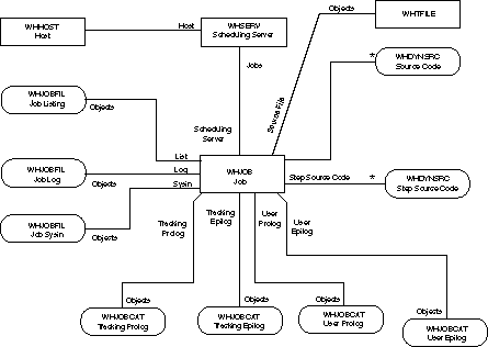 Each scheduled job requires a scheduling server association. When you request the SCHEDULING SERVER property of a job, a WHSERV object will be returned. The HOST property of WHSERV returns a WHHOST object that is the defined host for this scheduling server as shown in the following figure.