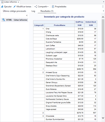 | Supongamos que la tienda de especialidades gastronómicas desea tener una liquidación de existencias y necesita un informe que muestre las existencias con que cuenta para cada producto organizadas por categoría. El informe debe mostrar el nombre del producto, el número de categoría, el precio de la unidad, y el número de unidades en stock. Puede utilizar el asistente Listar informes para crear un informe que contenga esta información. |